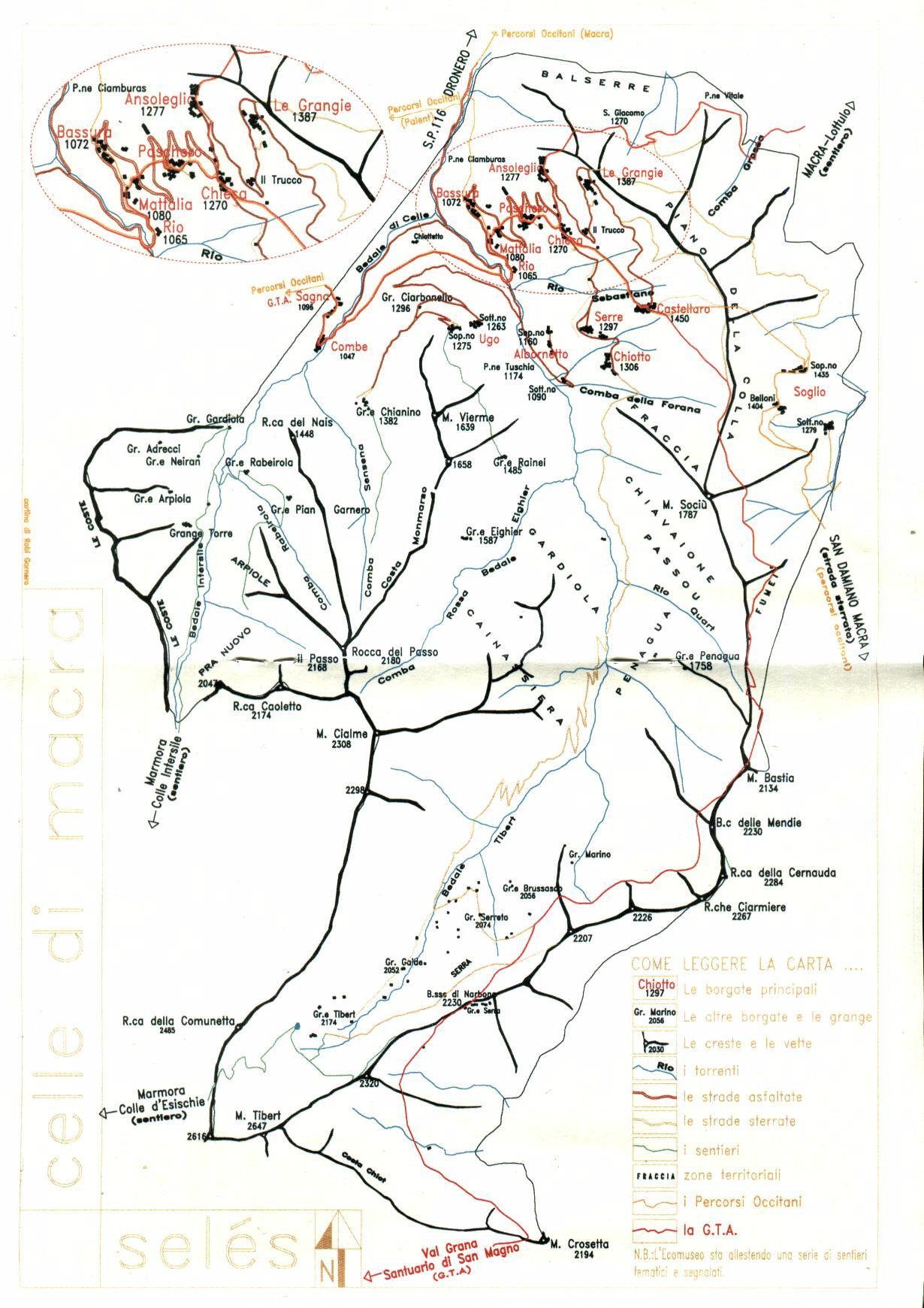 Anche l'uomo ha contribuito alla bellezza del paesaggio disseminando nel Vallone una dozzina di borgate che, malgrado l'usura del tempo, hanno conservato lo stile originario. Numerose le case e le baite sparse. Celle di Macra fu in passato un luogo importante di raccordo fra le Valli Maira e Grana, poiché vi transitava la mulattiera per Narbona e Castelmagno (oggi bel percorso GTA - Grande Traversata delle Alpi). Fitta la rete di mulattiere e sentieri: di raccordo fra le Borgate, fra queste e il fondo valle così come con i Valloni laterali di Combamala a est e di Marmora a ovest. Recenti carrarecce hanno sostituito gli antichi tratturi nel servizio degli alti pascoli e delle relative grange. STORIA I più antichi documenti relativi a Celle partono dal 1280; sono relativi ad arbitrati con i quali per oltre due secoli, ma con strascichi ancora nell'ottocento, si tenta di risolvere contese concernenti i pascoli di confine con le comunità di Castelmagno in Valle Grana. Appartenente dal secolo XIII al Marchesato di Saluzzo, Celle è uno dei dodici comuni della Valle che per secoli si reggono secondo "le buone consuetudini" formalizzate poi negli Statuti della Valle Maira. Con il Trattato di Lione del 1601 il territorio diviene possedimento sabaudo e feudo dapprima dei Cambiano di Ruffia conti di Paglieres e Cartignano, successivamente dei cuneesi Ferraris di Celle. Durante le contese di religione del secolo XVI, Celle difende la sua identità cattolica, ancora oggi testimoniata dalla Baijo che si celebra ogni anno per Sant'Anna in Borgata Castellaro, nell'ultima domenica di luglio. Passaggio di truppe sabaude e franco-ispane si ha durante la campagna delle Alpi Occidentali del 1744 (Guerra di successione d'Austria). Elevato il contributo di sangue nelle guerre mondiali del XX secolo, che vedono molti cellesi impegnati sui fronti di guerra. Coinvolto direttamente il territorio locale nella lotta partigiana 1943-45. Caratteristica tra la popolazione la professione di acciugaio ambulante (anciuè). Sviluppatasi nell'ottocento quale integrazione delle attività agricole (ma secondo alcuni risalente a più antiche immigrazioni di origine spagnola), essa vede i cellesi percorrere dal tardo autunno fino alla primavera le strade di Piemonte e Lombardia (ma non solo) con i carretti a mano, offrendo il pesce conservato sotto sale: un'attività stagionale che si trasforma progressivamente in permanente ed evolve con fortuna verso forme sempre più moderne di commercio. Il Museo dei mestieri itineranti, sito nell'ex Chiesa di San Rocco e specificamente riferito agli "anciuè", è preziosa testimonianza di questo passato. ARTE E ARCHITETTURA A meno di mezzo chilometro, sulla strada per Chiotto, si trova la Cappella di San Sebastiano. Qui il pittore itinerante Giovanni Baleison di Demonte dipinge nell'abside (1484) il martirio del Santo. Esemplari l'abbigliamento e l'armamento degli arcieri. Inquadrano la scena i Santi Fabiano Papa e Rocco. In alto l'Eterno Padre, in mandorla. Sulla parete laterale destra è rappresentato l'Inferno. In grandi riquadri sono descritti i peccati e le pene cui vengono sottoposti i dannati. Un demonio, indicato nominativamente, sovrintende a ogni scena. A sinistra si trovano le anime destinate alla salvezza eterna, rappresentata dalla Gerusalemme Celeste popolata di Santi. In una striscia sottostante compaiono le Virtù, purtroppo di difficile lettura salvo la suggestiva Fraternitas. L'altare, formato da un basamento dipinto coperto da una lastra di pietra, costituisce raro esempio quattrocentesco. Ancora a Giovanni Baleison è attribuita la bella Madonna dipinta sul muro esterno di una casa del capoluogo situata all'imbocco dell'antica strada per il cimitero. Modeste per contro le figure che la contornano, di epoca successiva (secolo XVII). Sempre in campo pittorico vanno citati i nove affreschi votivi che in diverse frazioni ha realizzato tra 1807 e 1808 Giors Boneto "pitore di Paisana" (Valle Po). Da menzionare il bel campanile romanico della Parrocchiale così come la vicina antica Chiesa di San Rocco risalente all'inizio del secondo millennio e ora ricuperata quale edificio polifunzionale, sede del Museo degli Acciugai. Tutte le borgate sono interessante esempio di architettura spontanea alpina. Molte le case d'origine medievale, in alcune delle quali si riconoscono elementi d'epoca quali finestre e architravi in pietra. Spiccano due edifici con facciata a vela rispettivamente siti nelle borgate Castellaro e Combe. Entrambi sono stati ricuperati. Il primo, detto Castello, gravemente danneggiato durante l'ultima guerra, è ora destinato a sede del Museo/laboratorio sulla costruzione alpina (il Cantunal), Da segnalare i resti degli antichi mulini in borgata Combe e il restauro del forno e delle pozze per la macerazione della canapa nella vicina borgata Sagna. Numerose le cappelle e i piloni votivi scaglionati nelle borgate o lungo i tradizionali percorsi. ESCURSIONI RACCOMANDATE: PERCORSI OCCITANI CIRCUITI ITINERARI LINEARI INDIRIZZI UTILI: : 0171/999835 e-mail: segreteria@comune.celledimacra.cn.it |